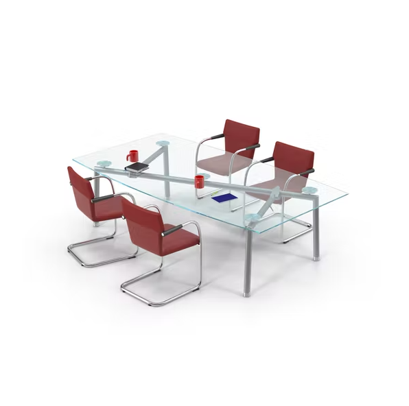 Meja meeting yang terbuat dari kaca secara visual akan jauh lebih menarik. Selain itu dengan tampilan yang mengkilap memberi kesan elegan, sejuk dan dingin. Kelemahan dari meja meeting kaca adalah meja ini bisa mudah retak jika tidak kuat menahan beban yang terllau berat diletakkan di atas meja. Maka sebaiknya Anda hanya menaruh barang-barang yang penting saja di atas meja meeting kaca ini.